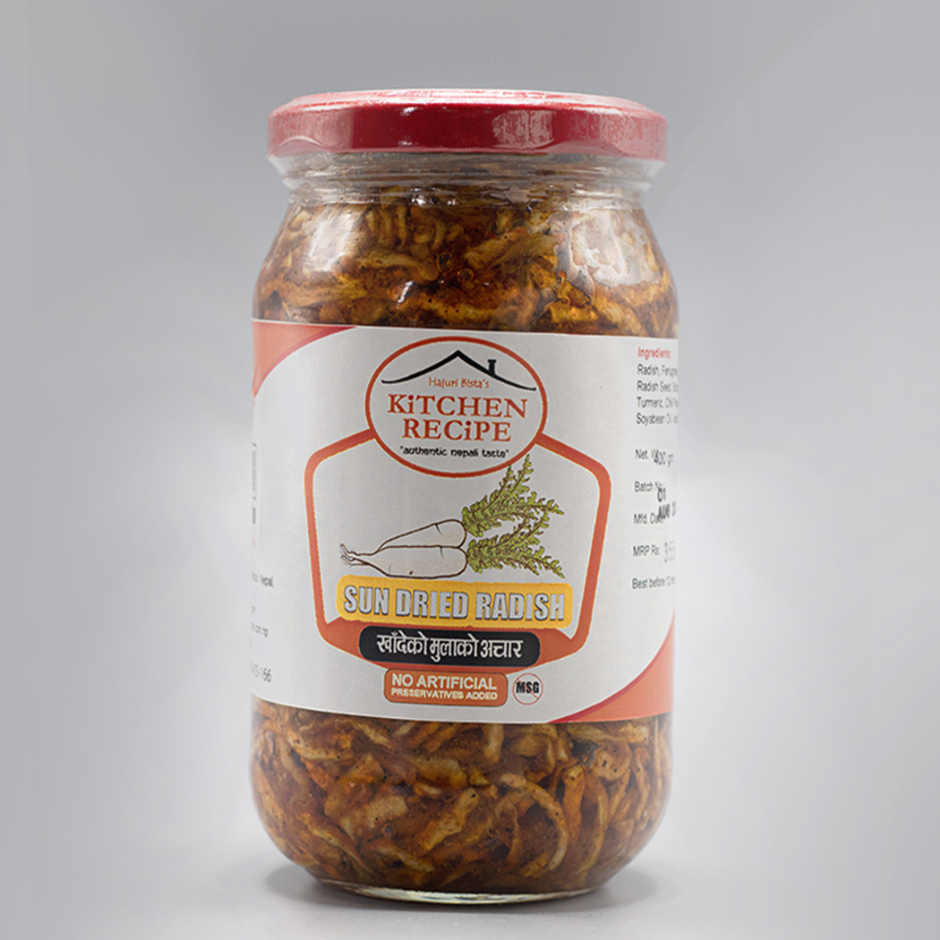 | An age-old tradition of using Sun as a natural preservative where Radishes are Sun-dried and mixed with traditional spices. A favorite of every household in Nepal. |